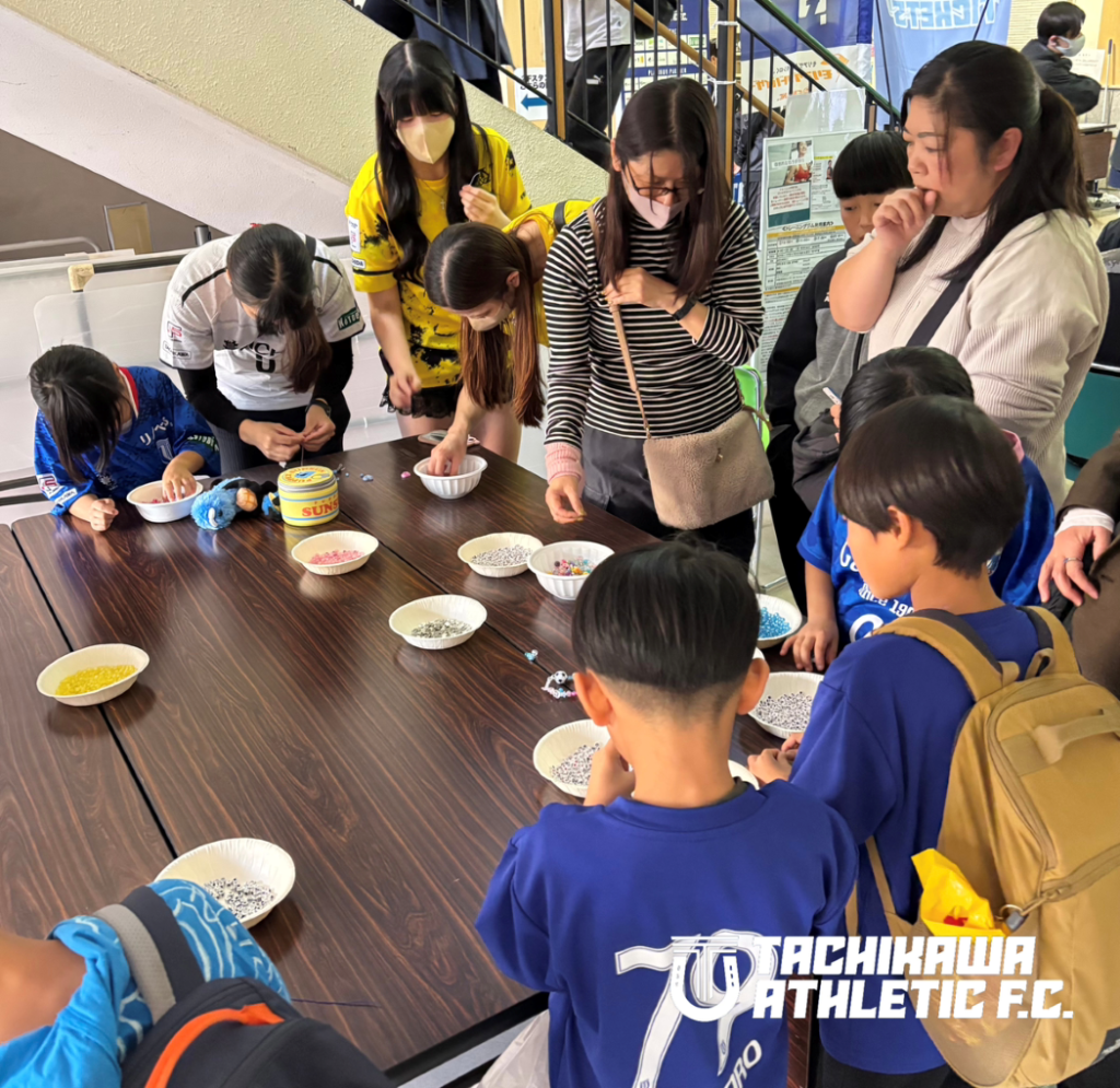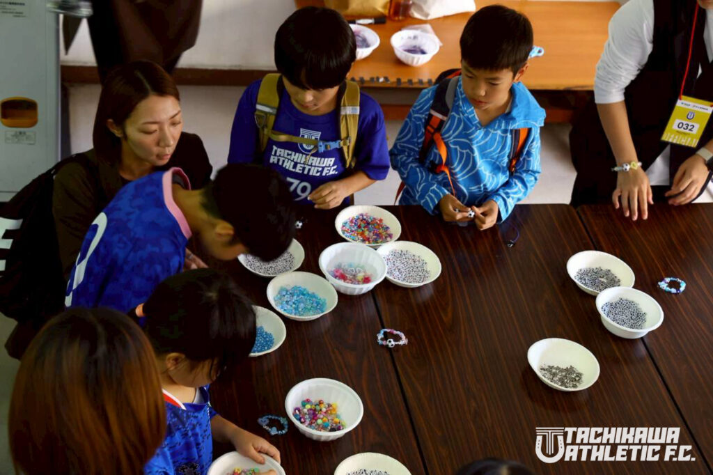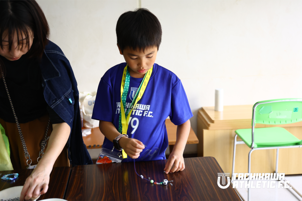 推し選手や自分の背番号、名前を入れたり、アスレブルーや好きな色のビーズを選んだりして、世界にひとつだけのオリジナルブレスレットを作りました。