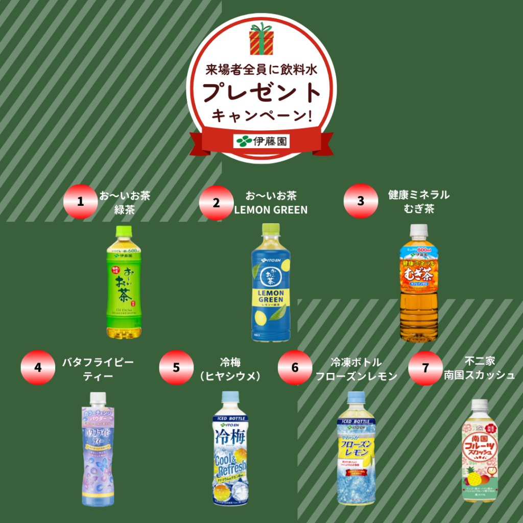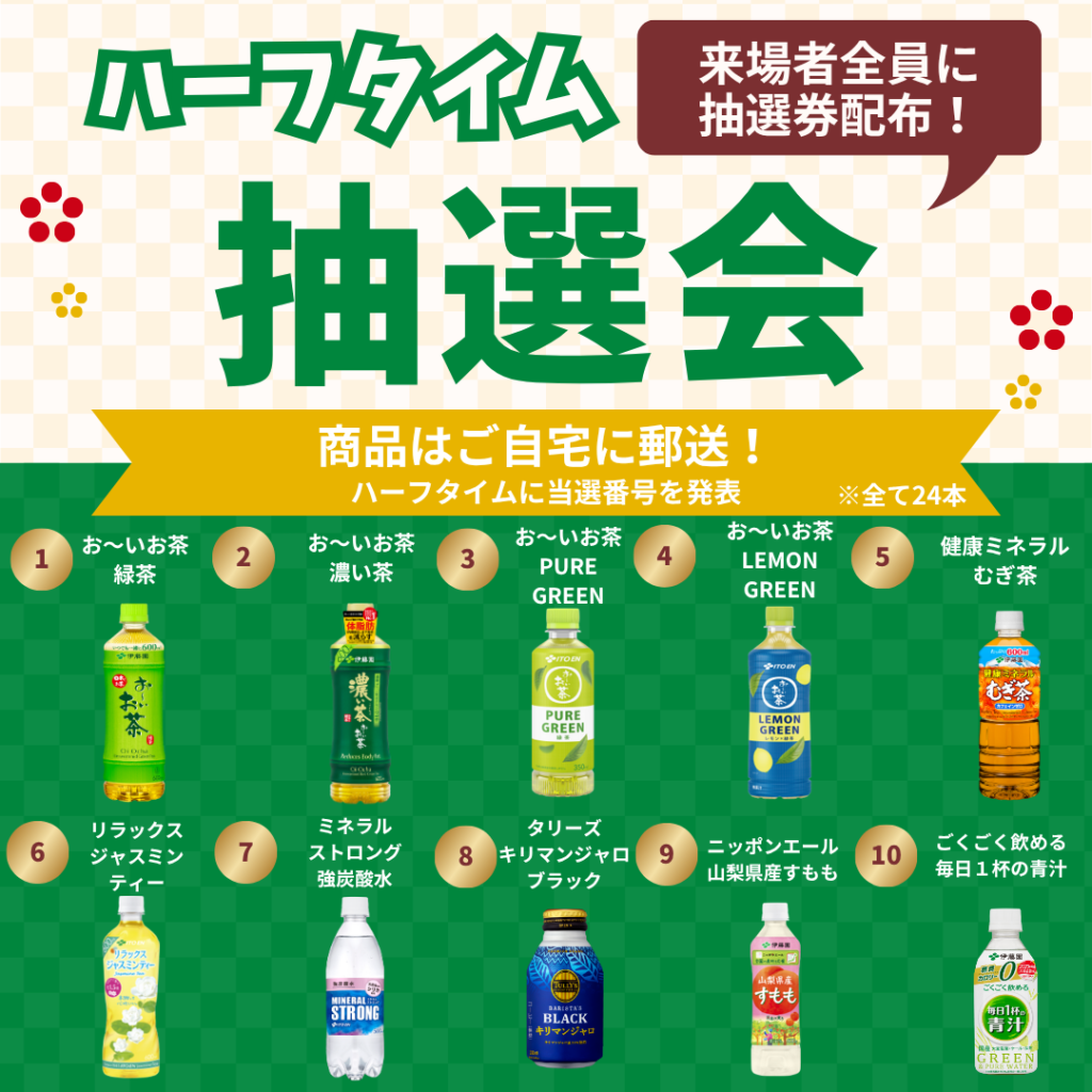 今年も「お~いお茶」や「健康ミネラルむぎ茶」など、7種類の飲料の中からお好きな1本を入場口でお渡ししました。