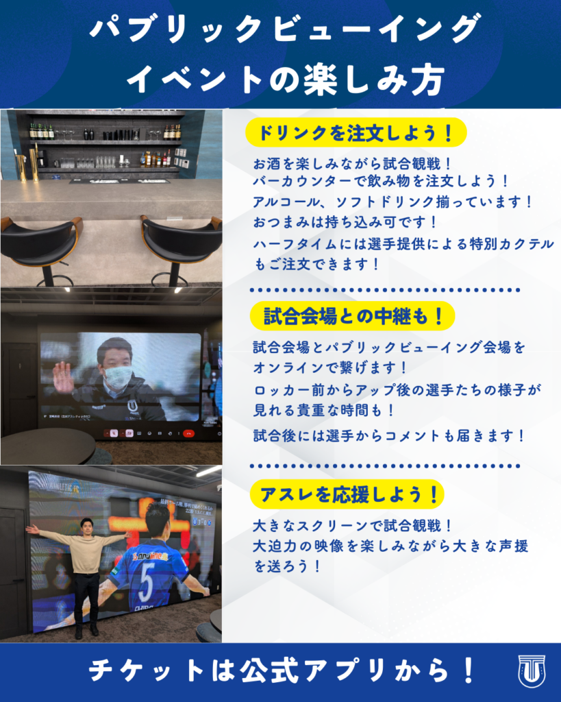 ぜひパブリックビューイング会場にお集まりいただき、立川アスレティックFCへ熱い応援をお願いいたします。