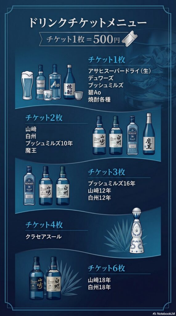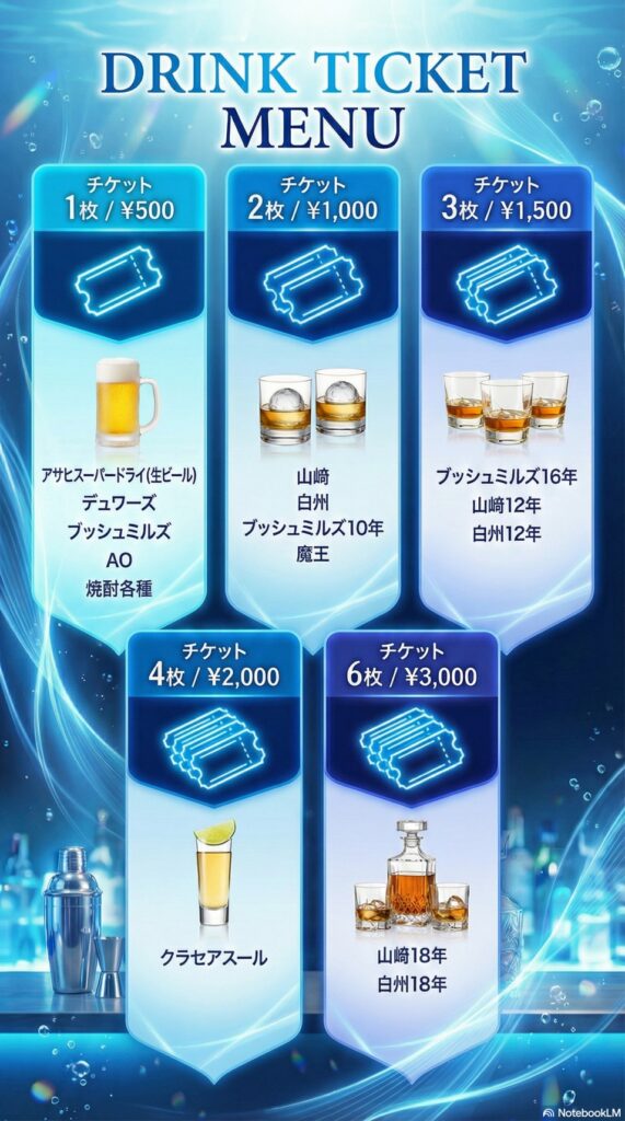 ドリンクチケットは、2,500円(500円ドリンクチケット×5枚)